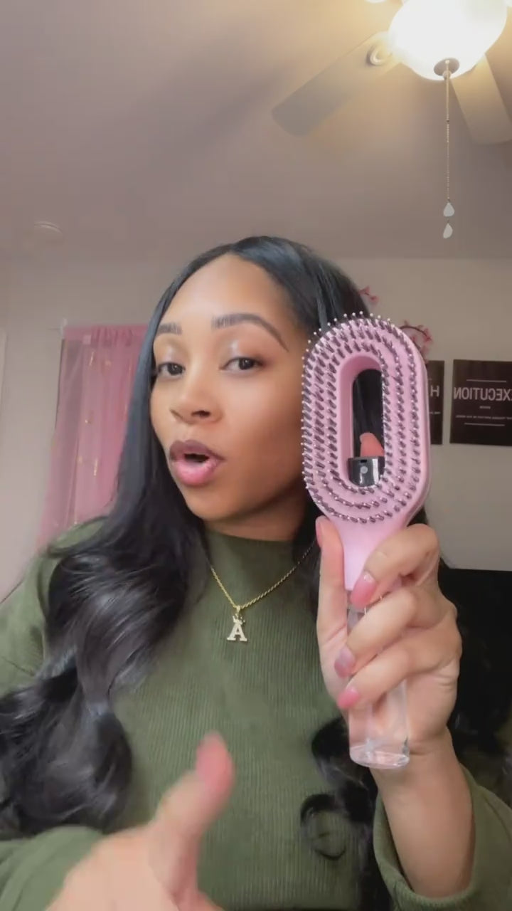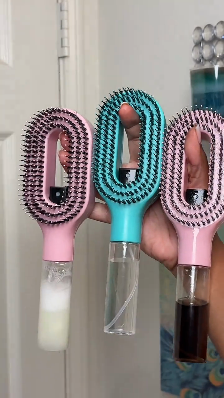 Brosse capillaire 2-en-1 avec pulvérisateur intégré, peigne démêlant et fonction massage du cuir chevelu. Équipée d’un réservoir compatible eau ou huiles essentielles, elle diffuse un brouillard fin et uniforme
